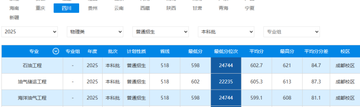 该校以石油工程、油气储运工程、海洋油气工程组成王牌专业组,覆盖能源行业全链条,兼顾办学底蕴与前沿方向,自设立至今,始终是西南石大最火热的一类本科专业。2025年高招季,上述三门专业仍保持高位优势,在各省录取分数均处于“第一梯队”,且至少超过当地本科线50分以上,尤其在四川、湖南、河北、陕西等省份,甚至出现超本科线90乃至100分以上的情况。