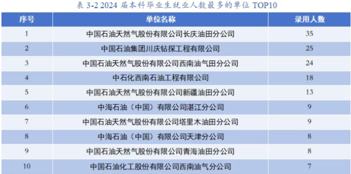 而正如文章开头所说,“石油大学”的就业是稳定的,“面向央国企就业”正是石油工程、油气储运工程、海洋油气工程的第三张“王牌”。近50%的毕业生赴事业单位就业;80%以上入职“三油一网”;专业对口度超95%;涵盖中国石油、中石化、中海油、国家官网、中联煤等行业龙头企业。